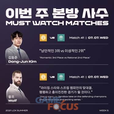 김동준 해설 위원과 '울프' 울프 슈뢰더 영어 해설 위원은 7일 열리는 리브 샌드박스와 담원 기아의 매치업을 반드시 시청해야 한다고 꼽았다. 김동준 해설 위원은 "두 팀의 매치업을 낭만적인 3위와 이성적인 2위의 대결"이라고 압축적으로 표현했으며 울프 슈뢰더는 "라이징 스타와 스프링 챔피언의 맞대결이기에 팽팽하고 흥미진진한 경기가 될 것"이라 예상했다.