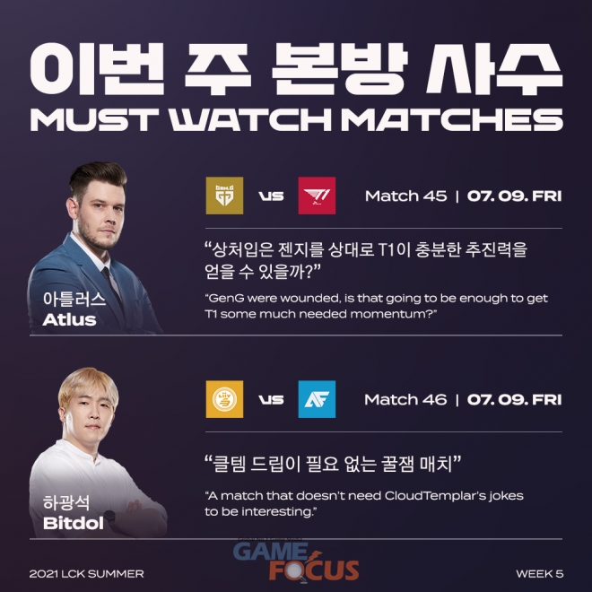영어 해설자인 'Atlus' 맥스 앤더슨은 9일 열리는 젠지와 T1의 대결을 이번 주의 중요한 매치업으로 뽑았다. 맥스 앤더슨은 “상처 입은 젠지를 상대로 T1이 충분한 추진력을 얻을 수 있을지 주목할 필요가 있다”라고 표현했다.
