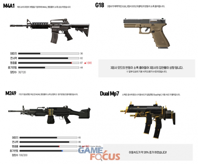 기존 무기들의 밸런스를 대폭 조정했다. 'M4A1', 'MAK-11', 'MAK-12'의 명중률을 상향하고, 'DUAL MP7'의 이동속도를 약 20% 증가시켜 답답함을 해소했다. 또, 'G18' 3점사 모드의 총기반동을 하향하고 'M249'의 명중률을 높이고 총기반동을 줄였다.