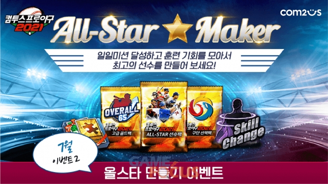 먼저, 올해 올스타전에 출전할 선수들을 주제로 한 게임 이벤트 '올스타 메이커'가 오는 25일까지 진행된다. 유저는 나눔과 드림 올스타에 선정된 선발 라인업 중 자신의 구단에 영입하고 싶은 선수를 선택해 능력치 상승을 위한 훈련을 진행할 수 있다. 매일 게임 내 주어지는 일일 미션 달성을 통해 '타격', '투구' 등 본인이 선택한 훈련 종류에 따라 가상의 능력치가 상승하게 되며, 훈련 횟수가 일정 수준 이상 도달할 경우 해당 선수 카드의 등급을 최대 플래티넘까지 업그레이드시킬 수 있다.