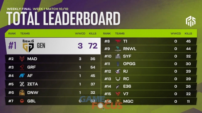 한국의 Gen.G(젠지)가 위클리 파이널에서 3치킨 72킬을 기록하며 1주 차 승리팀 영예를 차지했다. 1일 차에 3치킨을 획득한 Gen.G는 최다 킬을 기록하며 MaD Clan(매드 클랜)을 따돌리고 1위를 확정했다.