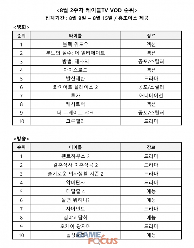 '블랙 위도우'와 '펜트하우스 3'이 각각 영화, 방송 케이블TV VOD 판매 순위 1위를 기록했다.