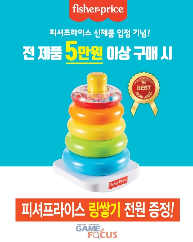 이번 이벤트는 피셔프라이스 '영어놀이' 시리즈와 '수면 완구' 등 신제품 입점을 기념한 행사로, 전국 토이저러스 매장에서 피셔프라이스 완구를 5만원 이상 구매한 고객에게 링쌓기 완구를 증정한다.