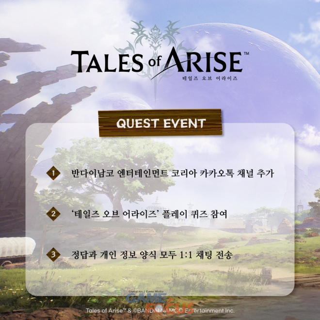 반다이남코 엔터테인먼트 코리아의 공식 카카오톡 채널에서는 '테일즈 오브 어라이즈'(한국어판)의 발매를 기념해 오는 9월 20일까지 누구나 참여할 수 있는 퀴즈 이벤트를 실시한다. 주어진 퀴즈의 정답을 이름, 연락처 등과 함께 1:1 채팅창에 전송하면 참여가 완료된다. 정답자 중 추첨을 통해 총 30명에게 본 작품의 주인공 '알펜'과 히로인 '시온'이 SD 캐릭터로 표현된 '스페셜 키링'을 선물한다.