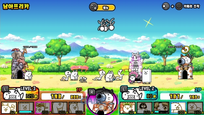 Nintendo Switch™용 '둘이서. 냥코 대전쟁'(한국어판)은 둘이서 협력・대전 플레이를 지원한다. 쉽고 간단한 배틀 시스템으로 남녀노소 누구나 즐길 수 있으며, 총 350개 이상의 징글귀염 냥코가 등장하는 방대한 볼륨의 스테이지를 체험할 수 있다.