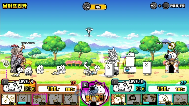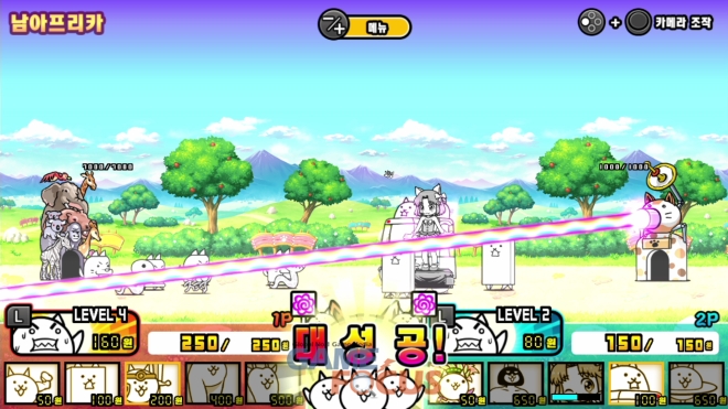 2인 플레이 시 '냥코 대포'가 2인 플레이 전용의 '초 냥코 대포'로 전환된다. '초 냥코 대포'는 어느 쪽이든 발동할 수 있으며 발동하면 에너지 게이지가 늘어난다. 둘이서 타이밍을 맞추어 게이지 양이 최대한 많을 때 발사 버튼을 누르자. 게이지가 많이 모일수록 '초 냥코 대포'의 위력이 증가한다.