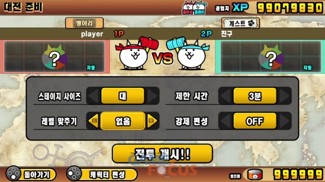 마지막으로 대전 준비 화면에서 스테이지 사이즈와 제한 시간, 레벨 맞추기, 강제 편성을 설정하고 대전을 시작하자.