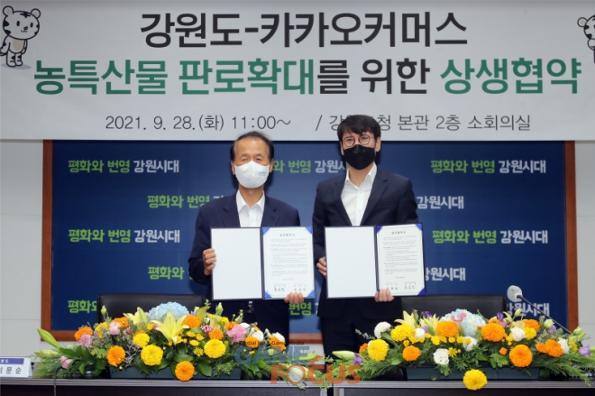 강원도와 카카오메이커스(이하 메이커스)가 9월 28일(화) 강원도 춘천시 도청에서 최문순 강원도지사와 카카오커머스 홍은택 대표가 참석한 가운데 상생 협약을 맺었다.