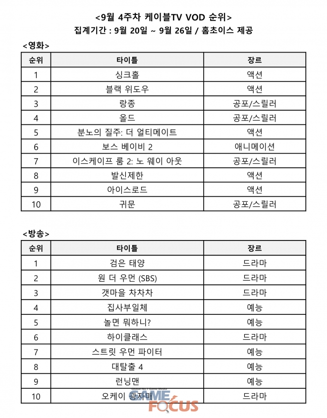 '싱크홀'과 '검은 태양'이 각각 영화, 방송 케이블TV VOD 판매 순위 1위를 기록했다.