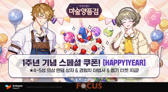 스마일게이트 메가포트는 '마술양품점'의 서비스 1주년을 기념하여 누구나 사용 가능한 스페셜 쿠폰을 준비했다. 이용자들은 쿠폰 사용 시 4성 이상의 의상, 경험치 마법서, 의상 및 가구 뽑기 티켓 등 다양한 아이템을 즉시 받을 수 있다. 또한, 24일까지 1주년 맞이 출석 이벤트와 특별 미션 이벤트도 진행돼, 게임에 접속만 해도 매일 다양한 선물을 받을 수 있어 보다 풍족한 플레이를 지원한다.