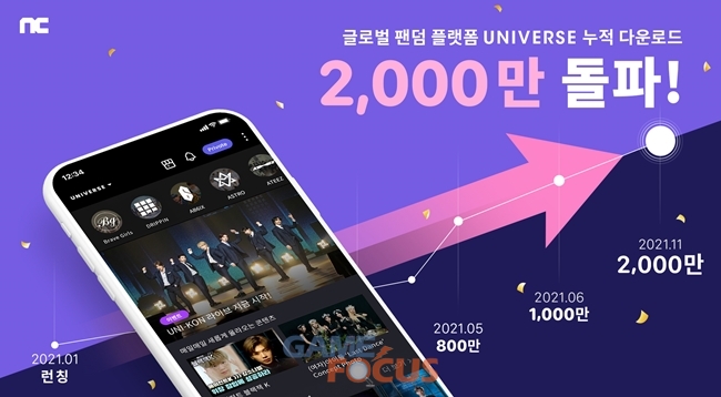 엔씨소프트(대표 김택진, 이하 엔씨(NC))가 글로벌 팬덤 플랫폼 유니버스(UNIVERSE)가 출시 후 약 10개월만에 글로벌 다운로드 2000만 건을 돌파했다고 밝혔다.