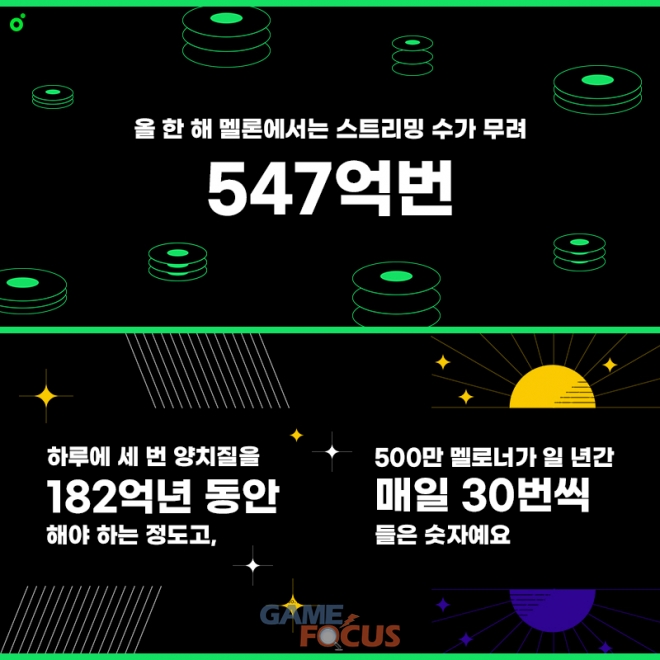 2021년 멜론에서 발생한 스트리밍은 무려 547억회인데 이는 하루 세 번하는 양치질을 182억년 동안 해야하는 횟수이고, 멜론의 500만 유료회원이 1년간 하루도 빠짐없이 매일 30번씩 음악을 들어야하는 방대한 양이다.