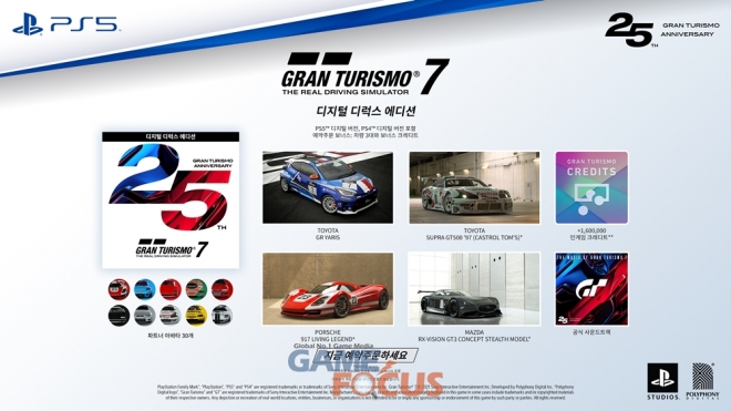 더불어, 업그레이드 비용 10,000원을 지불하면 PS4 플랫폼 그란 투리스모 7 스탠다드 에디션을 PS5 플랫폼 그란 투리스모 7 스탠다드 에디션 (다운로드 버전)으로 업그레이드할 수 있다. 본 업그레이드는 타이틀 출시와 동시에 지원된다.