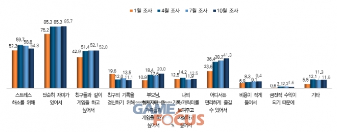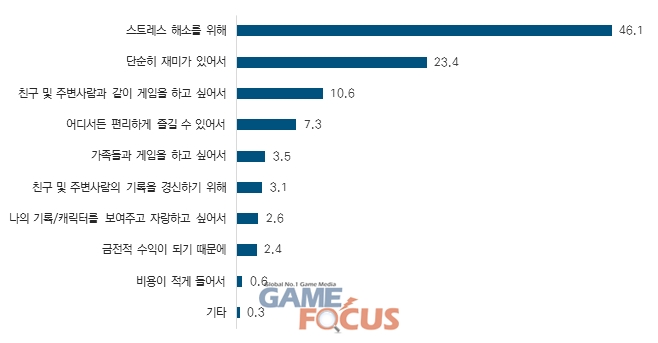 조사 결과, 일반 이용자의 경우 게임을 하는 주된 이유로는 ▲스트레스 해소를 위해(46.1%) ▲단순히 재미가 있어서(23.4%)로 나타났으며 청소년 이용자의 경우 ▲단순히 재미가 있어서가 82.9% 가장 높게 나타났다.
