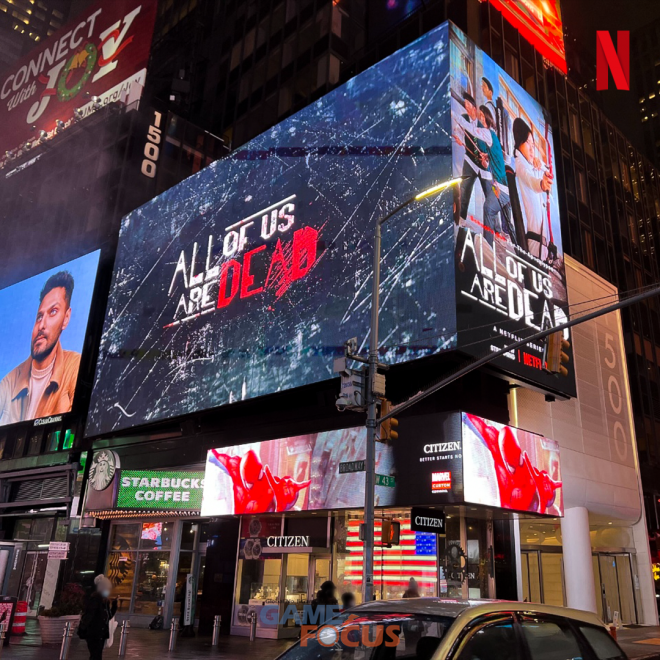 '지금 우리 학교는'의 열풍은 뉴욕의 타임스퀘어에서도 확인할 수 있다. 상징적인 장소 중 하나인 타임스퀘어에 걸린 대형광고가 '지금 우리 학교는'의 세계적 인기를 실감하게 만들고 있다. '지금 우리 학교는'은 극한 상황 속에서 우정과 사랑을 지키려 고군분투하는 학생들의 필사의 사투와 학교라는 특정한 공간을 이용한 다이내믹하고 창의적인 액션, 그리고 이 작품에서만 볼 수 있는 특별한 좀비 세계관 등으로 글로벌 시청자를 사로잡고 있다.