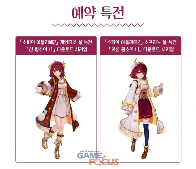 예약 특전으로는 '소피의 아틀리에2'의 주인공 소피의 의상 DLC로 각 예약 쇼핑몰 별로 다른 의상이 제공된다.