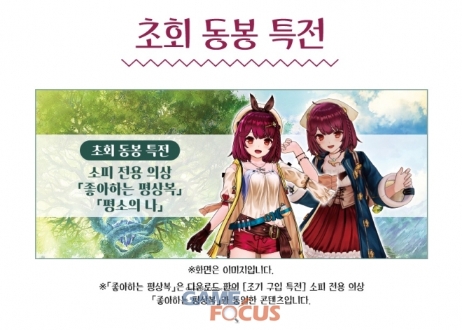초회 동봉 특전으로는 주인공 소피의 전용 의상인 '좋아하는 평상복'이 제공되는데 한글판에만 특별하게 '평소의 나' 의상도 추가되어 소피 전용 의상 총 2개를 다운로드 받을 수 있는 다운로드 특전 시리얼이 제공된다.