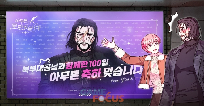 코미코는 ‘아무튼 로판 맞습니다’ 론칭 100일을 기념해 응원 댓글 참여자 전원의 닉네임을 적은 지하철 전광판 광고를 게재했다. 3월 31일까지 강남역, 신촌역, 판교역에 설치된 실제 전광판을 찾아 사진 인증을 하면 추첨을 통해 포토카드 및 실링왁스&편지지 세트 등의 한정판 특별 굿즈를 증정할 예정이다.