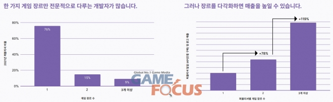 개발 스튜디오 전반에서도 다양한 툴과 서비스 활용을 늘리는 추세인 것으로 나타났다. 대규모 스튜디오 중 91% 이상이 플레이어 참여 및 세분화 서비스를 사용 중이며 이 밖에 인앱 구매 서비스(88%), 분석(76%), 인증 및 개인 정보 보호 서비스 등을 사용하고 있는 것으로 나타났다. 소규모 스튜디오 역시 수익화 및 사용자 확보 솔루션도 많이 사용하는 것으로 확인됐다.
