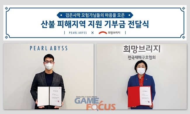 펄어비스는 4일 기부금 전달식을 열고 '희망브리지 전국재해구호협회'에 수익금을 전달했다. 기부금은 산불로 큰 피해를 입은 경북과 강원 지역의 복구 지원에 활용될 예정이다.