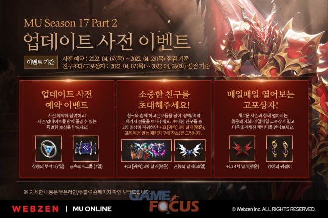 웹젠은 어제(4월 7일) ‘뮤 온라인’의 ‘시즌17-2 업데이트’ 관련 사전 이벤트 페이지를 열고 ‘사전 예약 이벤트’, ‘친구 초대 이벤트’ 등 다양한 이벤트 내용을 공개했다.