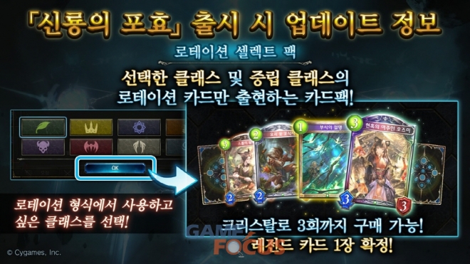 '로테이션 셀렉트 팩'은 선택한 클래스 및 중립 클래스의 로테이션 카드만 등장하는 카드팩으로, 크리스탈로 3회까지 구매할 수 있으며 레전드 카드가 확정 출현한다.