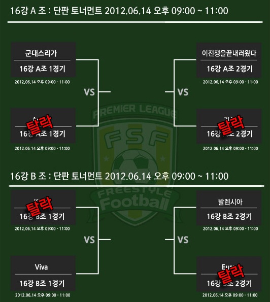 이날 16강 A,B조 8개팀의 경기를 통해 ‘군대스리가’, ‘이전쟁을끝내러왔다’, ‘Viva’ 그리고 ‘발렌시아’가 승리를 하며 8강에 먼저 선착 하였다.
