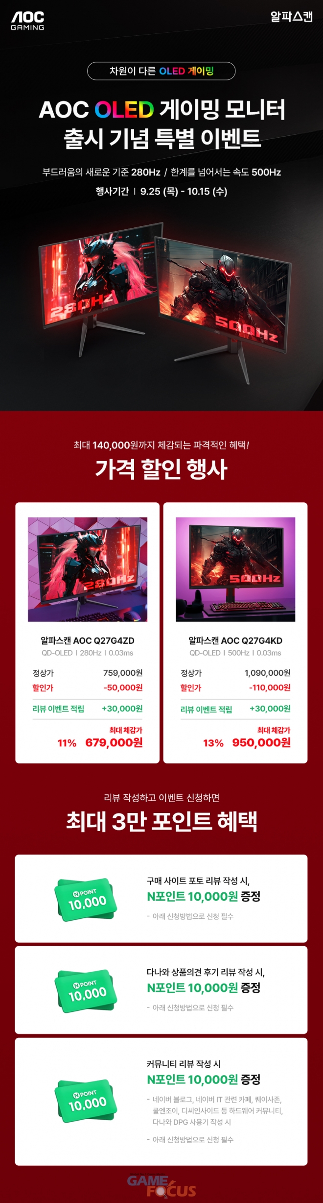 9월 25일부터 10월 15일까지 알파스캔 홈페이지, 네이버 브랜드스토어, 쿠팡에서 진행되는 출시 기념 행사에서 Q27G4KD는 11만원 할인된 980,000원에, Q27G4ZD는 5만원 할인된 709,000원의 특별가에 만나볼 수 있다. 무료 배송과 2년 무상 A/S는 물론, 구매 사이트에 포토/동영상 리뷰를 등록하면 N포인트 1만원을 제공한다. 네이버 블로그에 리뷰를 작성하면 N포인트 1만원, IT 관련 네이버 카페·하드웨어 커뮤니티·다나와 DPG에 리뷰 등록 시 추가로 N포인트 1만원이 지급되어, 모든 리뷰 참여 시 3만원의 포인트 혜택을 받을 수 있다.