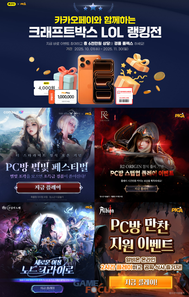 컴투스의 4세대 MMORPG 신작 ‘더 스타라이트’ 'PC방 별빛 페스티벌 이벤트'는 10월 19일까지 진행한다. 이용자는 피카PC방에서 매일 1시간 플레이 시 2,000 미션 마일리지를 받을 수 있으며, 플레이 시간에 따라 매일 200 별빛 조각을 획득할 수 있다. 획득한 별빛 조각으로 소환권 선택 상자, 게이밍 모니터, 미션 마일리지 등 다양한 경품에 응모할 수 있다.