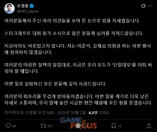 추석을 기념해 성사됐던 여야 의원들의 '스타크래프트' 대결에 더불어민주당 모경종 의원이 돌연 불참한다고 밝혔다. 모경종 의원은 "지금은 우리 모두가 '단일대오'를 이뤄 싸워야 할 때"라며 지지층에 사과했다.