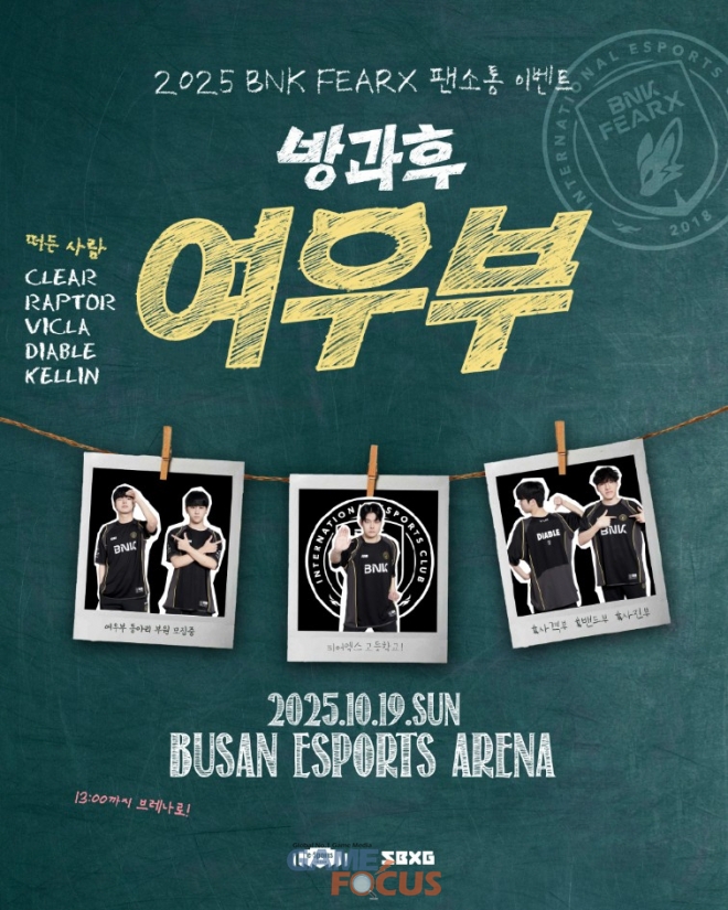 부산광역시를 대표하는 e스포츠팀 BNK 피어엑스(FEARX)는 오는 19일 홈경기장인 부산이스포츠경기장에서 2025 LoL 아시아 인비테이셔널(ASI) 우승 이후 팬들에게 첫 팬미팅을 개최한다고 밝혔다. ‘방과후 여우부’ 란 네이밍으로 진행되는 이번 팬미팅에는 CLEAR(클리어), RAPTOR(랩터), VICLA(빅라), DIABLE(디아블), KELLIN(켈린)으로 구성된 BNK 피어엑스 LCK 1군 완전체가 함께 한다.