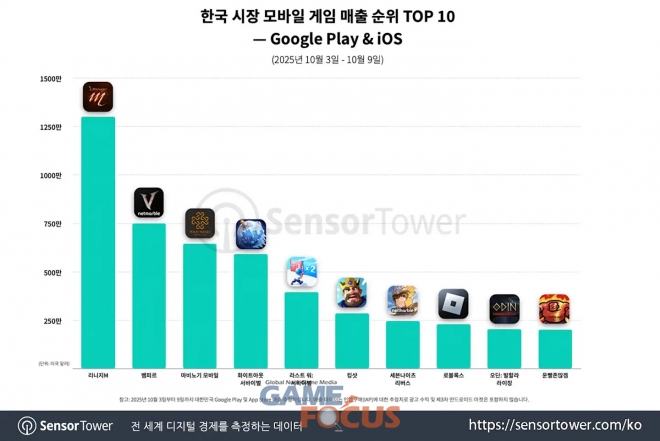 센서타워 앱 퍼포먼스 인사이트 시장 규모 데이터에 따르면, 10월 3일부터 9일까지 구글 플레이와 앱스토어를 합한 매출 추정치는 약 1억 2천만 달러로, 전주 대비 약 12% 증가했다. 스토어 별로 보면 구글 플레이가 11%, iOS가 14%가 증가하며 iOS에서 특히 강한 성장세가 나타났다.