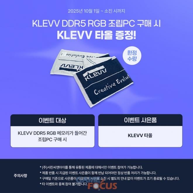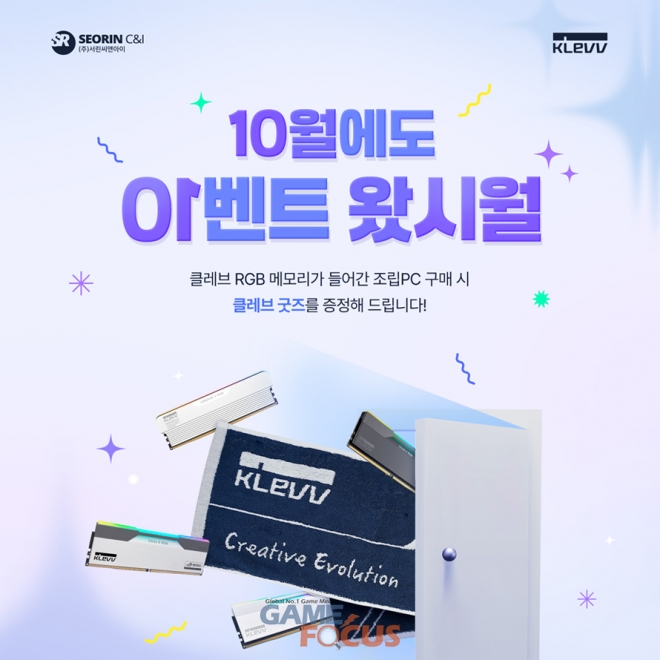 서린씨앤아이(대표: 전덕규)가 KLEVV DDR5 RGB 메모리가 포함된 조립PC 구매 고객을 대상으로 KLEVV 타올을 증정하는 10월 프로모션을 진행한다.