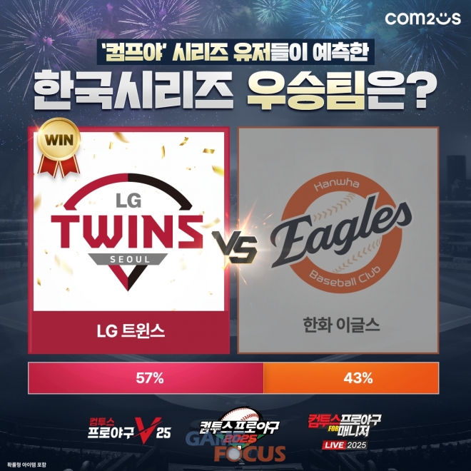 컴투스(대표 남재관)가 야구 게임 유저들을 대상으로 조사한 결과 ‘2025 KBO 한국시리즈’에서 ‘LG 트윈스’가 우승을 차지할 것으로 예측됐다.