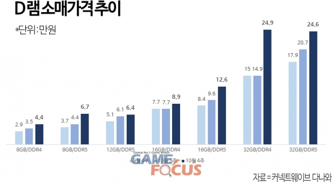 실제로 다나와가 집계한 RAM 유형별 평균구매가 추이에 따르면, 불과 1~2주 만에 가격이 수직 상승했다. DDR4 32GB형 제품은 10월 3주 평균 14만 9천 원대에서 4주 24만 9천 원대로 66.9% 상승했다.
