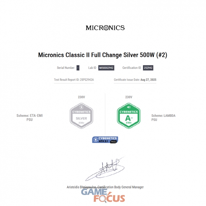 마이크로닉스 클래식 II 풀체인지 실버 ATX 3.1 시리즈는 사이베네틱스(Cybenetics)로부터 ETA SILVER 전력 효율 인증과 LAMBDA 소음 인증을 동시에 획득해 효율성과 정숙성을 입증했다. 이번 인증을 통해 클래식 II 풀체인지 실버 ATX 3.1 시리즈는 고출력 환경에서도 높은 전력 효율과 안정적인 작동, 그리고 조용한 동작음을 갖춘 고품질 파워서플라이(PSU)로 인정받았다.