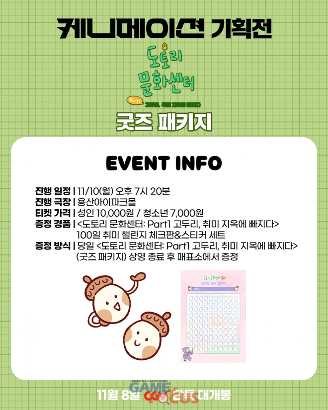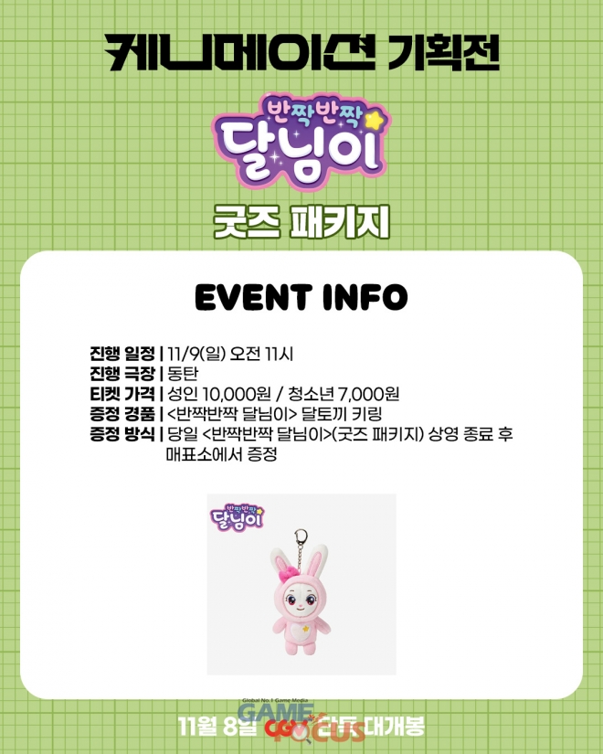 이어 상영작 굿즈를 소장할 수 있는 굿즈 패키지도 진행을 확정해 예비 관객들의 기대를 모은다. 굿즈 패키지 회차에 해당하는 상영작을 관람한 관객 전원에게는 작품별 특별한 굿즈가 증정된다. <반짝반짝 달님이>의 ‘달토끼 키링’은 11월 9일(일) 오전 11시 CGV 동탄에서, <도토리 문화센터: Part1 고두리, 취미 지옥에 빠지다> ‘100일 취미 챌린지 체크판 & 스티커 세트’는 11월 10일(월) 오후 7시 20분 CGV 용산아이파크몰에서, <지구의 주인은 고양이다>의 ‘키링(3종 중 1종 랜덤 증정)’은 11월 11일(화) 오후 7시 10분 CGV 용산아이파크몰에서 상영되는 회차 관람 시 상영 종료 후 매표소에서 수령할 수 있다. 이벤트와 관련한 자세한 내용은 CGV 공식 홈페이지 및 모바일 앱에서 확인할 수 있다.