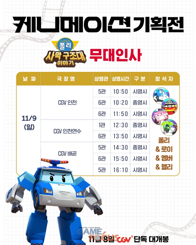 오는 8일(토) 개최를 앞두고 기획전을 더욱 특별하게 즐길 수 있는 다채로운 이벤트들이 진행돼 화제를 모은다. 먼저 애니메이션 속 캐릭터들을 실제로 만나볼 수 있는 코스튬 무대인사 진행을 확정했다. 기획전 개최일인 11월 8일(토)과 11월 15일(토)에는 <반짝반짝 달님이>의 ‘달님이’가 참석하는 무대인사가 총 13회차에 걸쳐 진행된다. 11월 9일(일)에는 <로보카폴리 사막 구조대 이야기>의 브룸스타운 구조대, ‘폴리’ & ‘로이’ & ‘엠버’ & ‘헬리’가 참석하는 무대인사가 총 8회차에 걸쳐 진행된다. 11월 14일(금)에는 <용한소녀>의 ‘용만이’가 참석하는 무대인사가 총 2회차에 걸쳐 진행되어 K-애니메이션 페스티벌을 더욱 풍성하게 만들 예정이다.