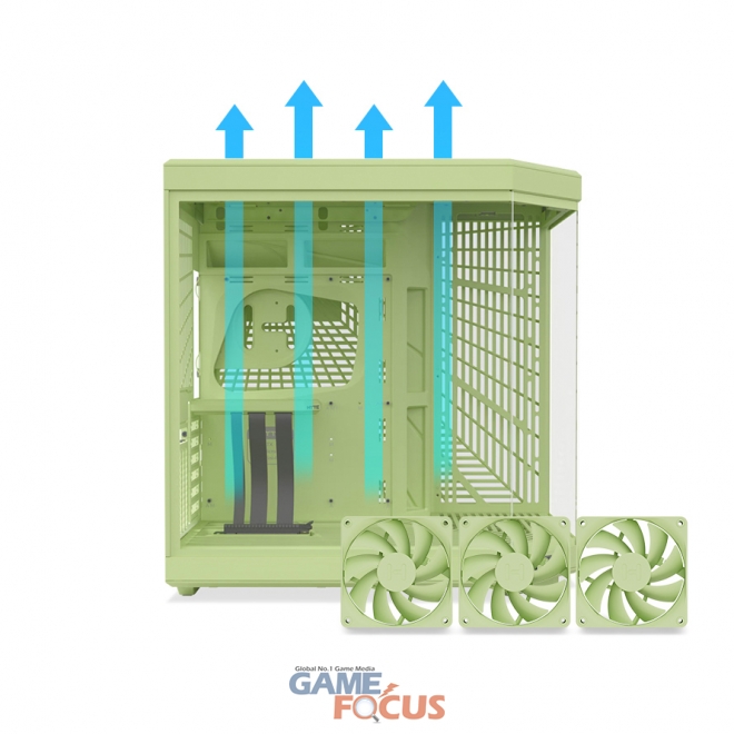 하이트 Y70은 3면 파노라믹 글래스와 듀얼 챔버 구조를 채택해 메인 하드웨어와 케이블/스토리지를 공간적으로 분리한다. 측면/하단에 걸친 대면적 통풍 설계와 라디에이터/팬 장착 유연성으로 공랭/수랭 구성 모두에 대응하며, 수직 GPU 연출과 RGB 튜닝에 적합한 내부 레이아웃을 제공한다.