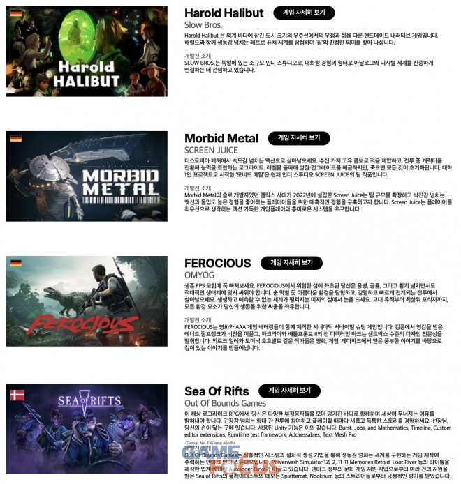 유니티 월드 존에서 만나볼 수 있는 해외 인디 게임은 ▲챈트 오브 세나르(런디스크), ▲인투 더 데드: 아워 다키스트 데이즈(픽폭), ▲코어 키퍼(퍼그스톰), ▲Hell Hell (MONORYLLIS), ▲AI 리미트(센스 게임즈), ▲성세천하: 여제의 탄생 I(뉴 원 스튜디오), ▲위스퍼 마운티 아웃브레이크(토게 프로덕션), ▲웨일드렛츠(웨일드웍스), ▲빅 보이 복싱(SoupMasters), ▲Sea Of Rifts(Out Of Bounds Games), ▲프로젝트 Z: 비욘드 오더(314 아츠 OHG), ▲타이니 북샵(네오루딕) 등 12개다.