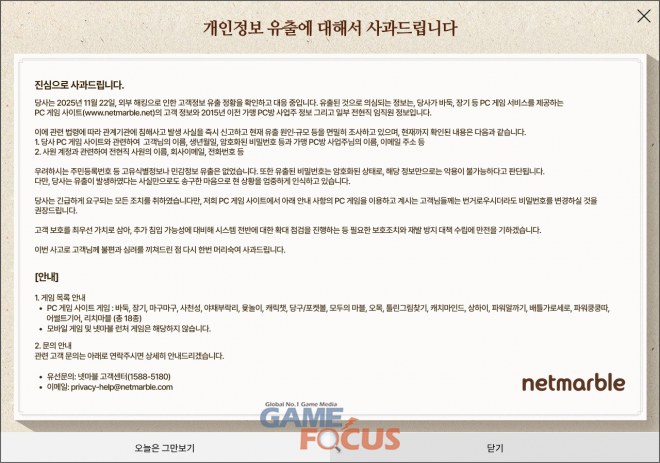 넷마블은 홈페이지를 통해 2025년 11월 22일 외부 해킹으로 인한 고객정보 유출 정황을 확인하고 대응 중이라고 밝혔다.
