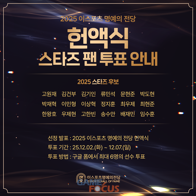 한국e스포츠협회가 16일 개최되는 '2025 이스포츠 명예의 전당 헌액식'을 앞두고, 팬들이 직접 선정하는 '스타즈' 투표를 7일까지 진행한다.