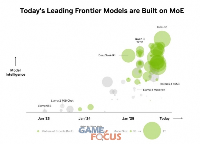 이러한 장점 덕분에 MoE가 최첨단 모델의 선호 아키텍처로 급부상한 것은 당연한 결과이다. 올해 공개된 오픈소스 AI 모델의 60% 이상이 이를 채택했다. 2023년 초 이후 MoE는 모델 지능을 약 70배 향상시켜 AI 능력의 한계를 확장해 왔다.