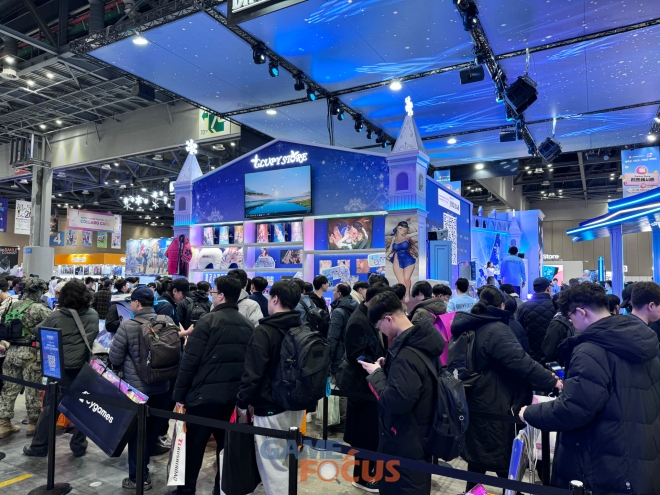 네오위즈는 이번 'AGF 2025' 현장에 계절감을 한껏 살린 겨울 왕국 콘셉트의 '브라운더스트2' 부스를 선보였다. 푸른색과 흰색이 조화를 이루는 컬러 테마와 거대 타워 LED 덕분에 유독 전시장 내에서도 눈에 잘 띄는 부스로 꾸며졌다.