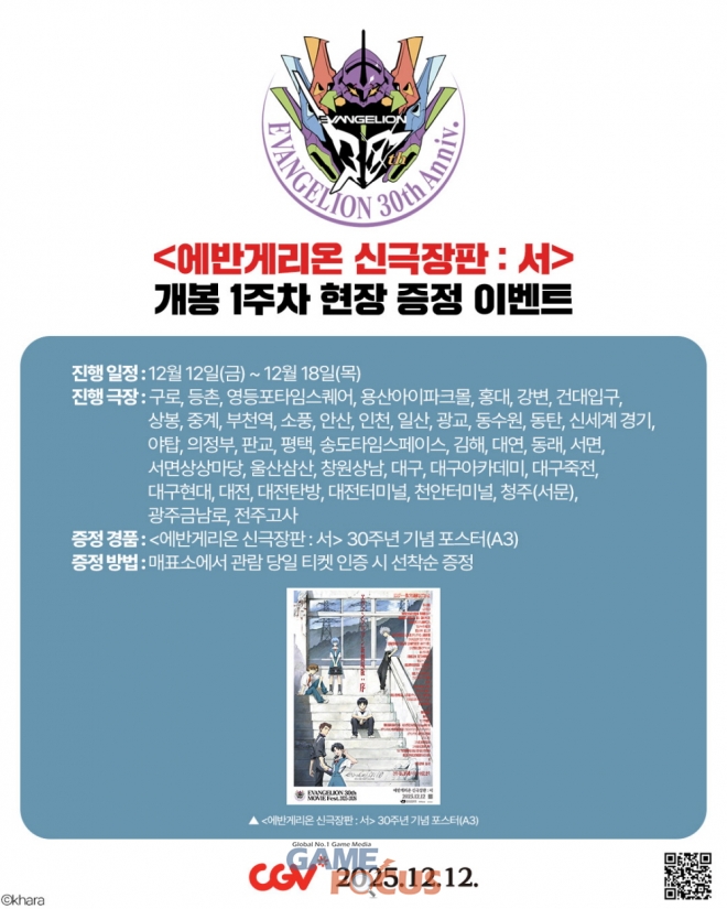 오는 12월 12일(금)부터 <에반게리온 신극장판 : 서> 개봉 1주차 현장 증정 이벤트로 ‘30주년 기념 포스터(A3)’가 제공된다. 이번 포스터는 영화의 감동을 더욱 깊게 간직할 수 있는 상징적인 아이템으로 팬들의 기대를 모은다. 특히 2007년 일본 개봉 당시의 오리지널 디자인을 그대로 담아, 붕괴된 건물의 계단 위에서 각기 다른 포즈로 서 있는 주인공들의 모습과 강렬한 붉은 타이포가 조화를 이루며 ‘에반게리온’ 특유의 심오한 분위기를 선명하게 드러낸다. 팬들에게는 작품의 정서를 다시금 되새길 수 있는 특별한 소장품으로 의미를 더할 것으로 보인다. 1주차 특전에 대한 자세한 내용은 CGV 홈페이지 및 앱을 통해 확인할 수 있다.