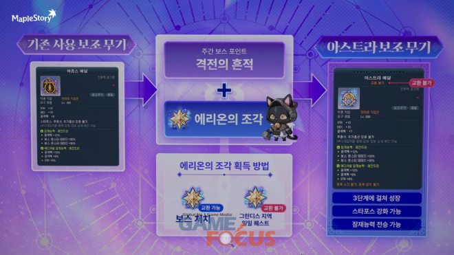 다음으로 신규 장비 아스트라 보조무기 추가도 공개됐다. 제네시스 무기 퀘스트 완료 후 그란디스 지역의 보스를 퇴치하면 얻을 수 있는 '격전의 흔적'과 고난이도 보스 몬스터 퇴치나 그란디스 일일 퀘스트를 통해 획득할 수 있는 '에리온의 조각'을 모아 성장시킬 수 있는 보조무기로, 3단계에 걸친 성장 단계에 따라 강화 가능한 스타포스 수치를 확대할 수 있다. 더불어, 기존 보유하고 있는 보조무기의 잠재능력을 전승할 수 있다.