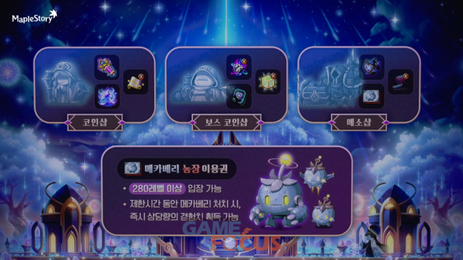 또, 미지의 존재 ‘엘라노스’를 성장시켜 단계에 따라 외형, 엘라노스 스킬 등이 성장하는 신규 이벤트와 280레벨 이상 캐릭터가 구매할 수 있는 ‘모멘텀 패스’, ‘메카베리 농장’ 등의 신규 콘텐츠를 포함하는 겨울 이벤트 ‘환영이 내리는 밤’과 신규 캐릭터 대상의 겨울나기 육성 지원 이벤트를 진행한다.