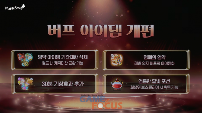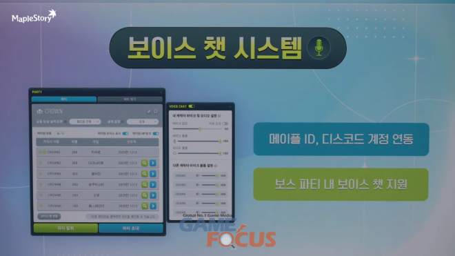 ‘크라운(CROWN)’ 개선사항 또한 공개했다. 인게임 보이스 챗 도입, 버프 아이템을 편하게 구매하고 확인할 수 있는 버프 매니저 시스템 추가, 영약 아이템의 기간 제한 삭제를 포함한 버프 아이템 개편, 소울을 보다 편하게 관리할 수 있는 소울 컬렉션 개편, 월드 메소 통합 등이 발표됐다.