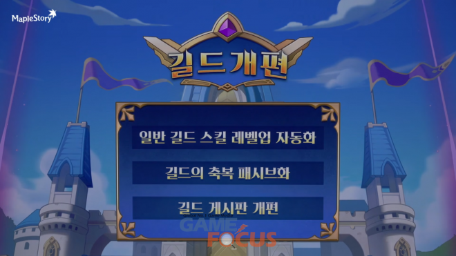 길드 시스템의 기존 기능 개편을 포함한 신규 길드 콘텐츠 ‘길드 캐슬’에 관한 정보도 공개했다. 길드원이 함께 모여 교류할 수 있는 6개 맵으로 선보이며, 이와 함께 일반 길드 스킬 레벨 자동 상승, 길드의 축복 패시브 스킬 전환, 길드 게시판 개편 등의 개선사항을 적용한다.