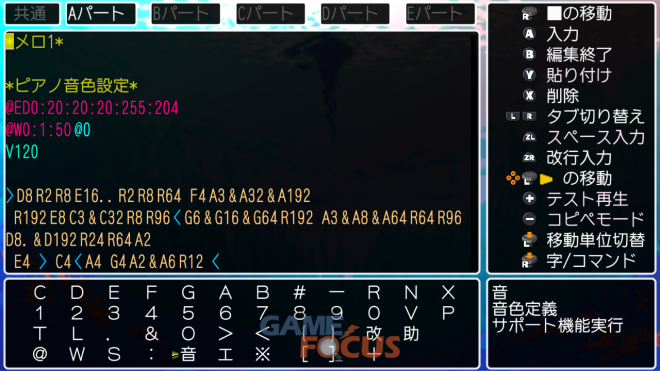 직접 만들 수 있는 건 캐릭터 뿐만 아니라 이번 타이틀에서는 BGM을 제작할 수 있는 「음악」이 강화되었다. 핑크 노이즈 관련 기능을 지원하여 리듬 악기와 효과음을 만들 수 있고, 음색 정의 및 엔벨로프 정의, 매크로 기능까지 지원하면서 더욱 다양한 음악 제작이 가능해졌다.